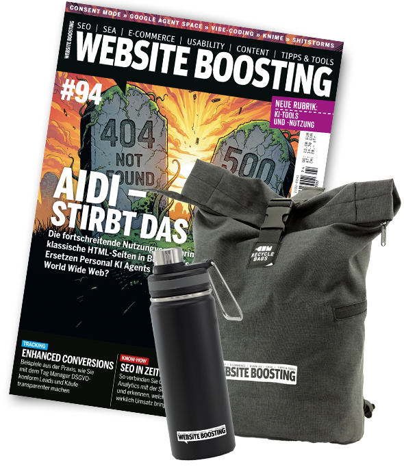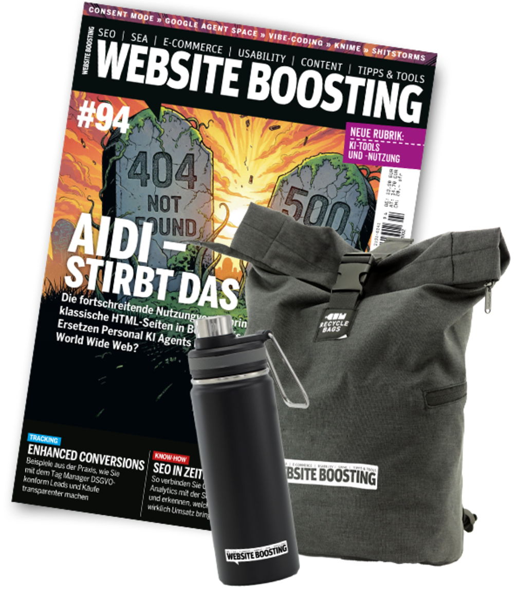 ich möchte Website Boosting beziehen und einen Rucksack aus 18 recycelten PET-Flaschen oder eine Edelstal-Trinkflasche (590ml) geschenkt bekommen (Achtung: Abo-Prämien Versand nur nach D/AT). Ich erhalte Website Boosting ein Jahr (6 Ausgaben) zum Preis von EUR 73,00 inkl. MWSt. und Versandkosten im Inland (Ausland: EUR 82,- inkl. Versandkosten) zugeschickt. Das Abo kann ich jederzeit mit einer Frist von 6 Wochen zum Ende eines Bezugsjahres schriftlich kündigen.