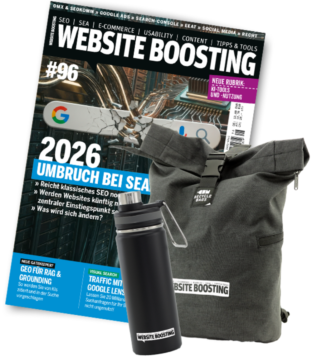 ich möchte Website Boosting beziehen und einen Rucksack aus 18 recycelten PET-Flaschen oder eine Edelstal-Trinkflasche (590ml) geschenkt bekommen (Achtung: Abo-Prämien Versand nur nach D/AT). Ich erhalte Website Boosting ein Jahr (6 Ausgaben) zum Preis von EUR 73,00 inkl. MWSt. und Versandkosten im Inland (Ausland: EUR 82,- inkl. Versandkosten) zugeschickt. Das Abo kann ich jederzeit mit einer Frist von 6 Wochen zum Ende eines Bezugsjahres schriftlich kündigen.